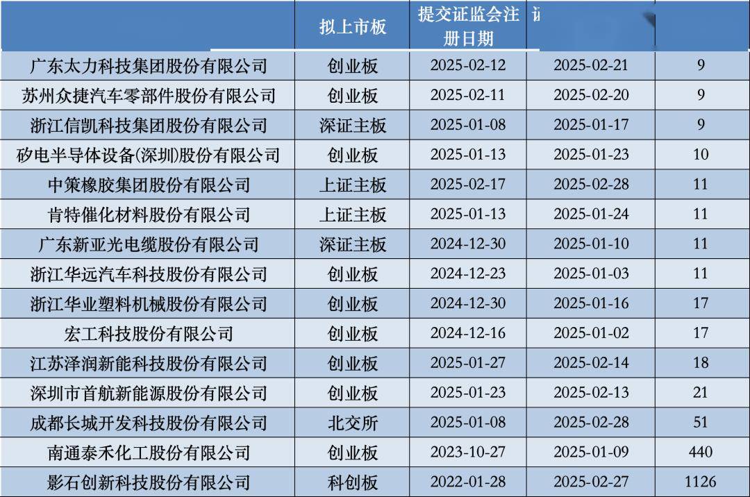 这4家企业分别为广东太力科技集团股份有限公司、苏州众捷汽车零部件股份有限公司、浙江信凯科技集团股份有限公司、矽电半导体设备(深圳)股份有限公司,前3家均耗时9天,第4家则刚好耗时10天。上述企业均是在2025年1月份或者2月份提交注册的。
