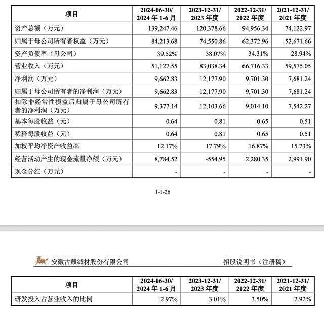 据招股书,2021年-2023年及2024上半年,古麒绒材实现收入分别为5.96亿元、6.67亿元、8.3亿元、5.11亿元;归母净利润分别为7681.24万元、9701.30万元、1.22亿元、9662.83万元。