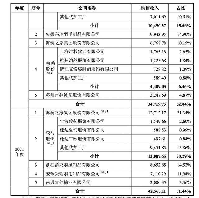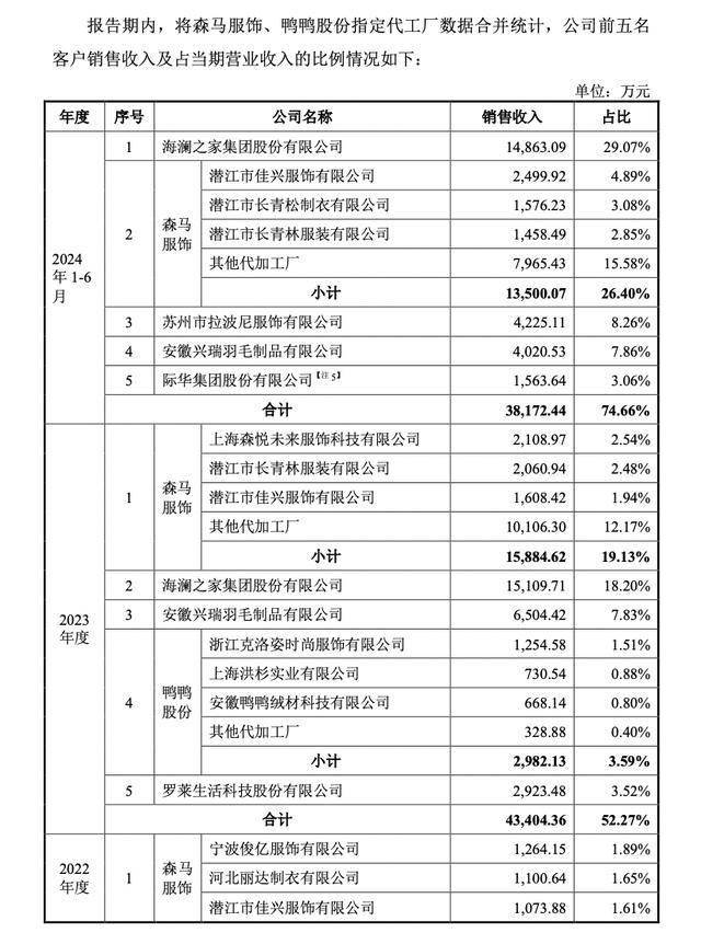 其中,海澜之家于2021年及2024上半年均位列公司第一大客户,销售金额占比分别为21.34%、29.07%;2023年位列第二大客户,销售金额占比为18.2%。