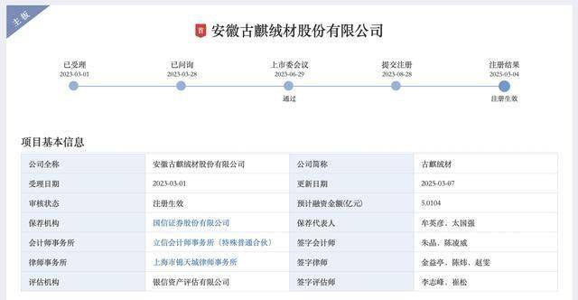 据了解,古麒绒材2023年8月28日提交注册,从提交注册至获得注册批文用时一年半。