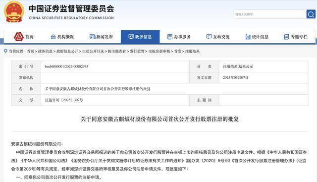 瑞财经 吴文婷3月7日,据中国证监会披露,安徽古麒绒材股份有限公司(以下简称“古麒绒材”)IPO注册获通过,国信证券保荐。