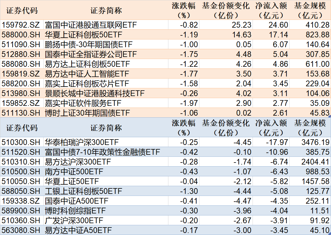与此同时,华泰柏瑞沪深300ETF基金份额减少4.45亿份,净流出额17.97亿元;富国中债7-10年政策性金融债ETF基金份额减少0.10亿份,净流出额10.96亿元;易方达沪深300ETF基金份额减少1.74亿份,净流出额6.74亿元。