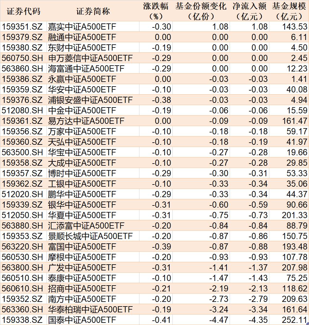 此外,上周五场内29只中证A500ETF合计净流出21.32亿元,其中有1只获得资金增持。