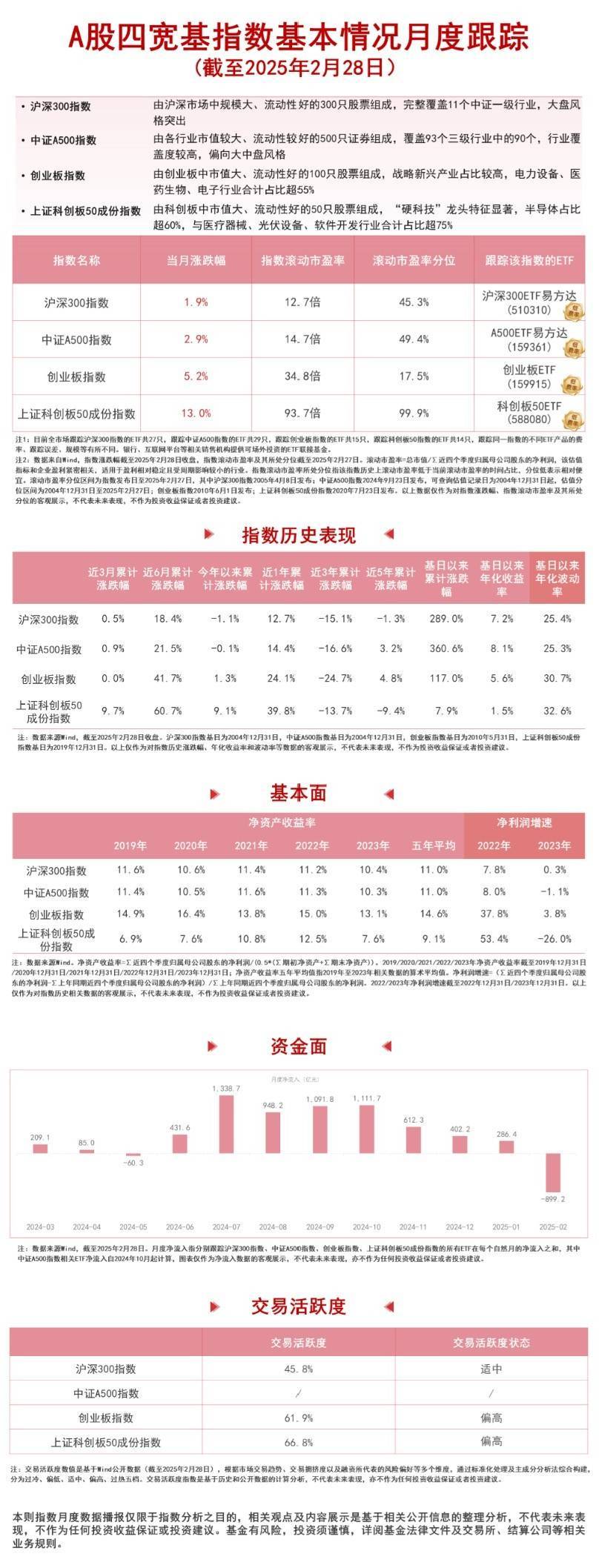 2月,沪深300指数上涨1.9%,中证A500指数上涨2.9%,创业板指数上涨5.2%,上证科创板50成份指数上涨13.0%。