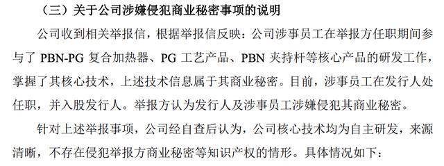 北京通美表示,根据举报信反映:公司涉事员工在举报方任职期间参与了 PBN-PG 复合加热器、PG 工艺产品、PBN 夹持杆等核心产品的研发工作,掌握了其核心技术,上述技术信息属于其商业秘密。目前,涉事员工在发行人处任职,并入股发行人。举报方认为发行人及涉事员工涉嫌侵犯其商业秘密。针对上述举报事项,公司经自查后认为,公司核心技术均为自主研发,来源 清晰,不存在侵犯举报方商业秘密等知识产权的情形。