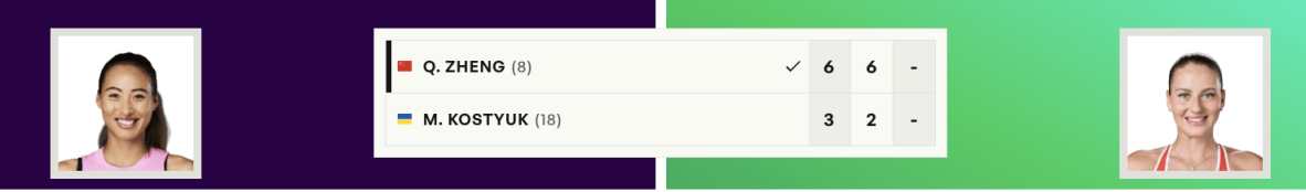 比赛开场后,郑钦文在首盘第4局打出漂亮的反拍直线得分,兑现第三个破发点,拿到本场的首次破发。不过科斯秋克也不示弱,用高质量的接发表现保持对抗。双方随后展开破发大战,郑钦文连续三局破发后,保住个人的第5个发球局,以6比3先下一城。