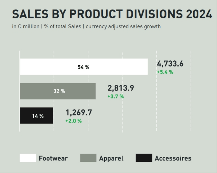 在各项品类中,对公司2024财年销售的贡献从高到低依次是鞋类(54%)、服饰(32%)以及配饰(14%)。其中,全年增幅最大的是鞋类,为5.4%,服饰(3.7%)和配饰(2.0%)紧随其后。