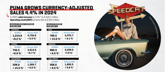 公司称,得益于所有地区、产品部门和分销渠道的增长,彪马全年销售额增长4.4%至88.172亿欧元,而2024年增长的主要阻力来自货币汇率波动,这对以欧元计算的销售额产生了约1.5亿欧元的负面影响。
