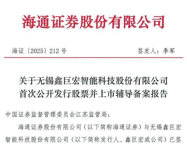 乐居财经 严明会3月12日,无锡鑫巨宏智能科技股份有限公司(以下简称:鑫巨宏)在江苏证监局完成IPO辅导备案,辅导机构海通证券。