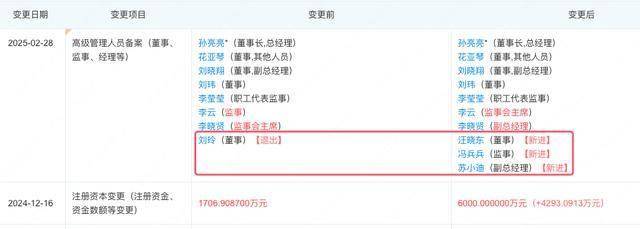 2025年2月,刘玲退出董事,新进汪晓东为董事、苏小迪为副总经理。