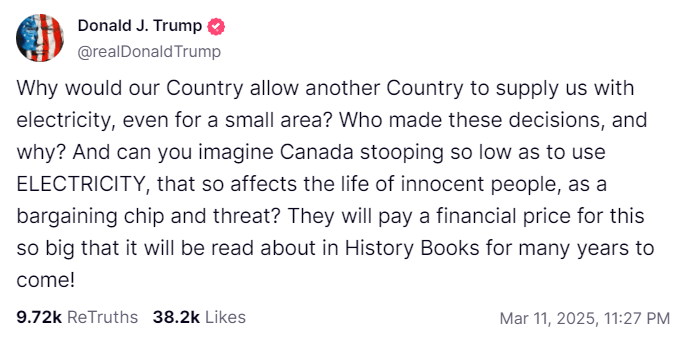 特朗普11日在“真实社交”平台发文质问:“为什么我们的国家会允许另一个国家为我们供电,即使是一小块地区?”他还表示,加拿大正在用影响美国人生活来作为与美国谈判的筹码和威胁。