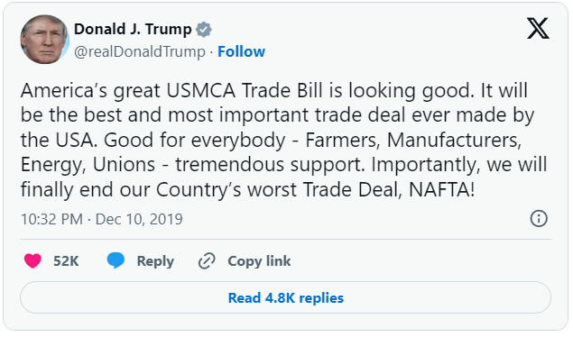 在注意到特朗普这一表态后,《每日野兽》等媒体和网民还找到了特朗普在2019年12月发布的一则网帖,他当时在网帖中盛赞USMCA,称“这将是美国有史以来达成的最好、最重要的贸易协议。”