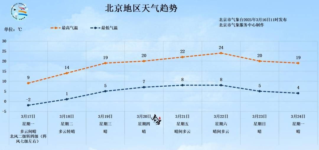 据气象北京报道,3月18日开始,北京以晴到多云为主,气温起飞,一路飙升。尤其22日白天最高气温升至24℃左右,但昼夜温差大,早晚寒凉,春捂不可少。预计3月17日至24日,白天最高气温9~24℃,夜间最低气温 -2~8℃。