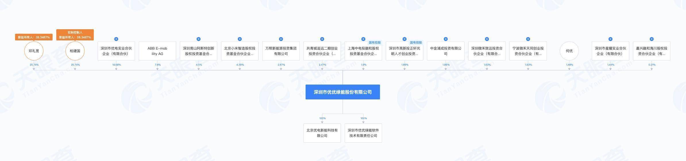其中,柏建国为优优绿能董事长、总经理,邓礼宽为该公司董事、副总经理。据招股书披露,优优绿能的共同控股股东为柏建国和邓礼宽,实际控制人为柏建国和邓礼宽,二人合计持股56.70%,合计控制的股权比例为67.60%。