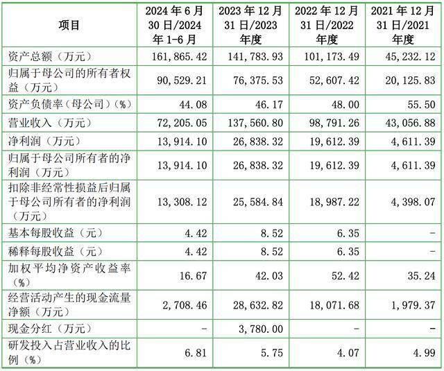 2021年、2022年、2023年和2024年上半年,优优绿能的营收分别约4.31亿元、9.88亿元、13.76亿元和7.22亿元,净利润分别约4611.39万元、1.96亿元、2.68亿元和1.39亿元,扣非后净利润分别约为4398.07万元、1.90亿元、2.56亿元和1.33亿元。