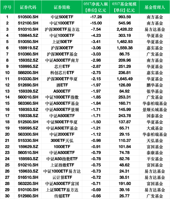 Wind数据显示,3月17日,中证500ETF遭净赎回17.28亿元,中证1000ETF遭净赎回15亿元,沪深300ETF易方达遭净赎回7.54亿元。一图看懂昨日股票ETF净赎回TOP30排行榜>>