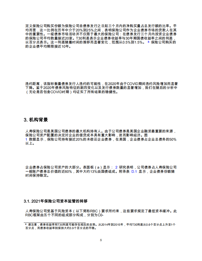 3. 核心发现:长期无风险利率是保险公司私人债务需求的关键影响因素。保险公司在资产期限和投资收益间权衡,T30利差(企业债券收益率与30年期国债收益率之差)上升1个百分点,保险公司购买份额上升5.88个百分点,参与发行的保险公司数量增加5家。保险公司投资行为受货币政策影响显著。紧缩货币政策使长期无风险利率上升10个基点,保险公司企业债券购买份额下降8个百分点,购买新发行债券的保险公司减少8家。保险公司在货币政策向风险溢价传导中作用关键。当保险公司在投资者基础中占比更大或监管政策变动使其对长期国债利差反应更强烈时,风险溢价对货币政策冲击更敏感。如保险公司持股比例每上升1个百分点,长期国债收益上升10个基点,EBP上升0.2个基点;风险权重每增加1个标准差,信用风险溢价对T30收益率10个基点变动的敏感性增加9.7个基点。
