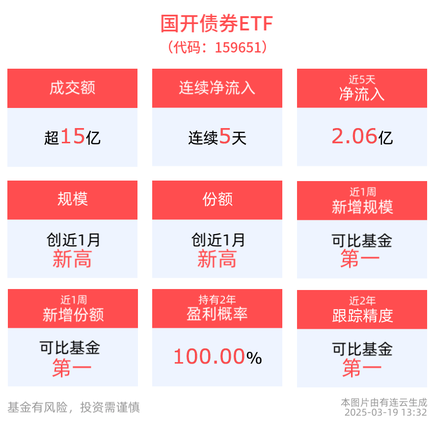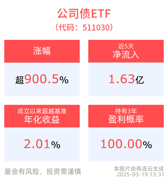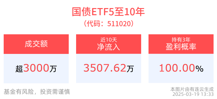 拉长时间看,截至2025年3月18日,公司债ETF近1年累计上涨2.26%。国开债券ETF近1年累计上涨2.24%。国债ETF5至10年近半年累计上涨1.60%。