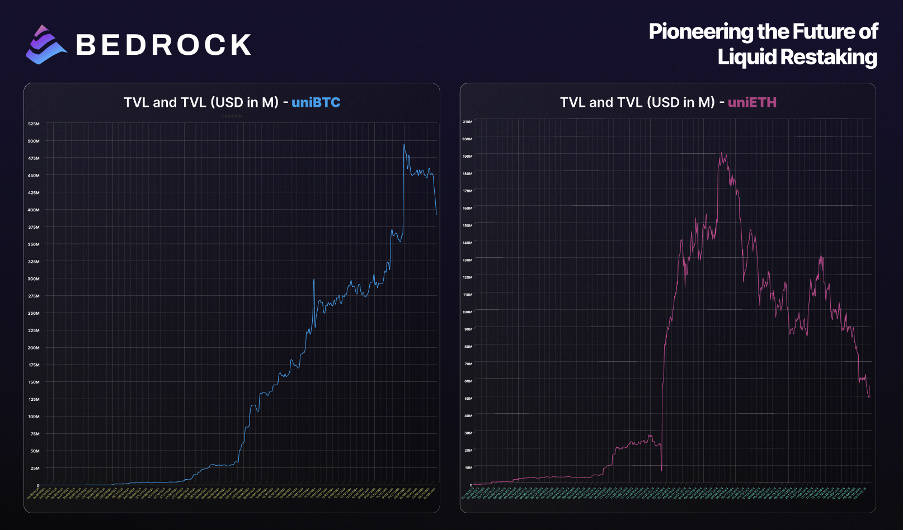 据 Bedrock 官方报告,截止目前,自 24 年 4 月至今项目总 TVL 在持续攀升中。