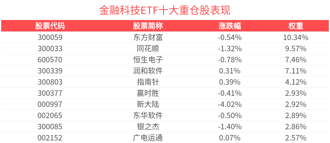 数据显示,截至2025年2月28日,中证金融科技主题指数(930986)前十大权重股分别为同花顺(300033)、东方财富(300059)、恒生电子(600570)、润和软件(300339)、东华软件(002065)、指南针(300803)、新大陆(000997)、赢时胜(300377)、广电运通(002152)、银之杰(300085),前十大权重股合计占比53.94%。