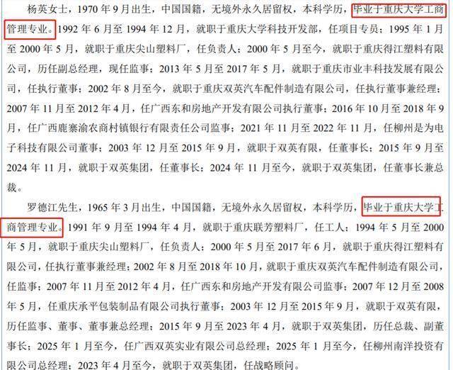 杨英,1970年9月出生,中国国籍,无境外永久居留权,本科学历,毕业于重庆大学工商管理专业。1992年6月至1994年12月,就职于重庆大学科技开发部,任项目专员;1995年1月至2000年5月,就职于重庆尖山塑料厂,任负责人;2000年5月至今,就职于重庆得江塑料有限公司,历任副总经理,现任监事;2013年5月至2017年5月,就职于重庆市业丰科技发展有限公司,任执行董事;2002年8月至今,就职于重庆双英汽车配件制造有限公司,任执行董事兼经理;2007年11月至2012年4月,任广西东和房地产开发有限公司执行董事;2016年10月至2018年9月,任广西鹿寨渝农商村镇银行有限责任公司监事;2021年11月至2022年11月,任柳州是为电子科技有限公司董事;2003年12月至2015年9月,就职于双英有限,任董事长;2015年9月至2024年11月,就职于双英集团,任董事长;2024年11月至今,就职于双英集团,任董事长兼总裁。
