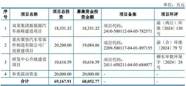 双英集团本次北交所IPO拟募集资金6.81亿元,募集资金拟投向包括双英集团新能源汽车座椅建设项目、重庆聚贤汽车零部件制造有限公司厂房新建项目、研发中心升级建设项目和补充流动资金。