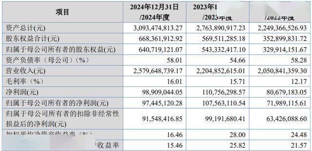业绩方面,2022年度-2024年度(报告期内),公司营业收入分别为20.51亿元、22.05亿元、25.80亿元;净利润分别为0.81亿元、1.11亿元、0.99亿元。