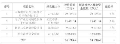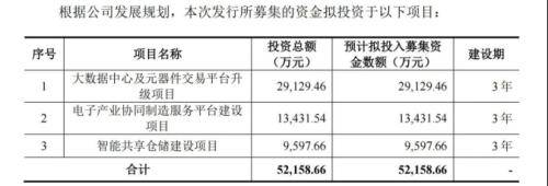 招股书显示,云汉芯城此次拟募集资金5.22亿元,主要包括2.91亿元的大数据中心及元器件交易平台升级项目、1.34亿元的电子产业协同制造服务平台建设项目、9597.66万元的智能共享仓储建设项目。