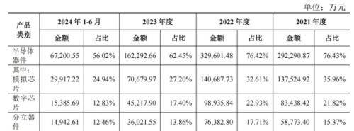 报告期内,云汉芯城B2B电子元器件销售业务中来自半导体器件的收入分别为29.23亿元、32.97亿元、16.23亿元、6.72亿元,占营收的比例分别为76.43%、76.42%、62.45%、56.02%。