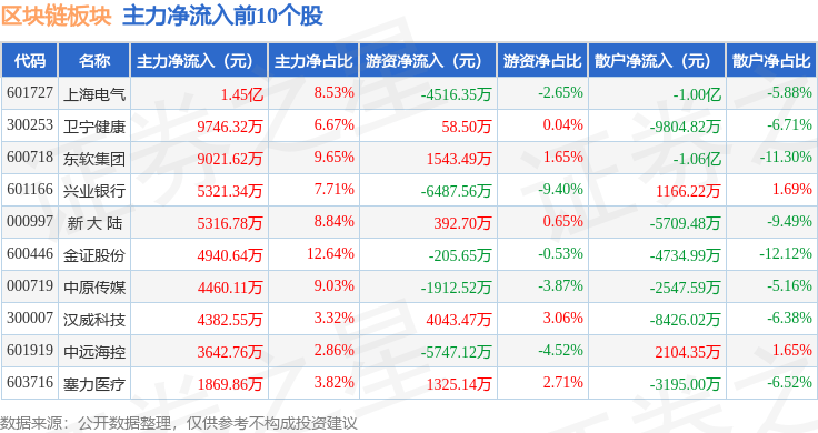 从资金流向上来看,当日区块链板块主力资金净流出60.54亿元,游资资金净流入5.0亿元,散户资金净流入55.54亿元。区块链板块个股资金流向见下表: