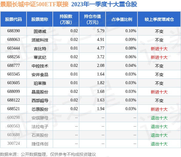 景顺长城中证500ETF联接为指数型-股票基金,根据最新一期基金季报显示,该基金资产配置:无股票类资产,无债券类资产,现金占净值比6.22%。基金十大重仓股如下: