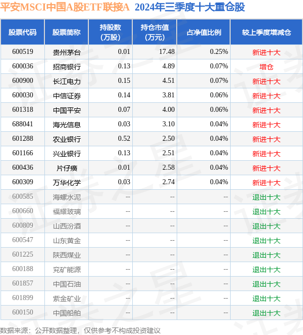 平安MSCI中国A股ETF联接A为指数型-股票基金,根据最新一期基金季报显示,该基金资产配置:无股票类资产,债券占净值比3.16%,现金占净值比2.91%。基金十大重仓股如下: