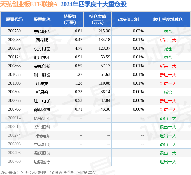天弘创业板ETF联接A为指数型-股票基金,根据最新一期基金季报显示,该基金资产配置:股票占净值比0.18%,无债券类资产,现金占净值比5.9%。基金十大重仓股如下: