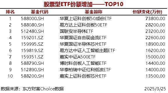 每经AI快讯,据东方财富Choice数据统计,昨日共18只股票型ETF当日份额增加超1亿份,华夏上证科创板50成份ETF增加7.38亿份,易方达上证科创板50ETF增加2.82亿份。