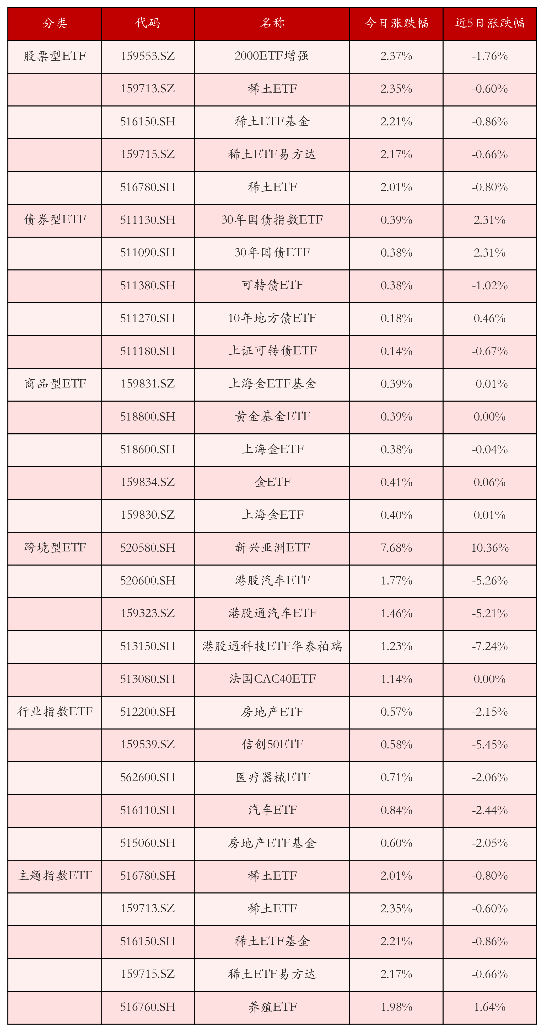 从不同投资种类、行业、主题的ETF产品中找出今日走势行情排名前5的ETF基金,今日涨幅靠前的ETF产品如下表所示。股票型ETF中涨跌幅排名前3位的ETF产品分别为2000ETF增强(159553.SZ)、稀土ETF(159713.SZ)和稀土ETF基金(516150.SH),今日收益率分别为2.37%、2.35%和2.21%。