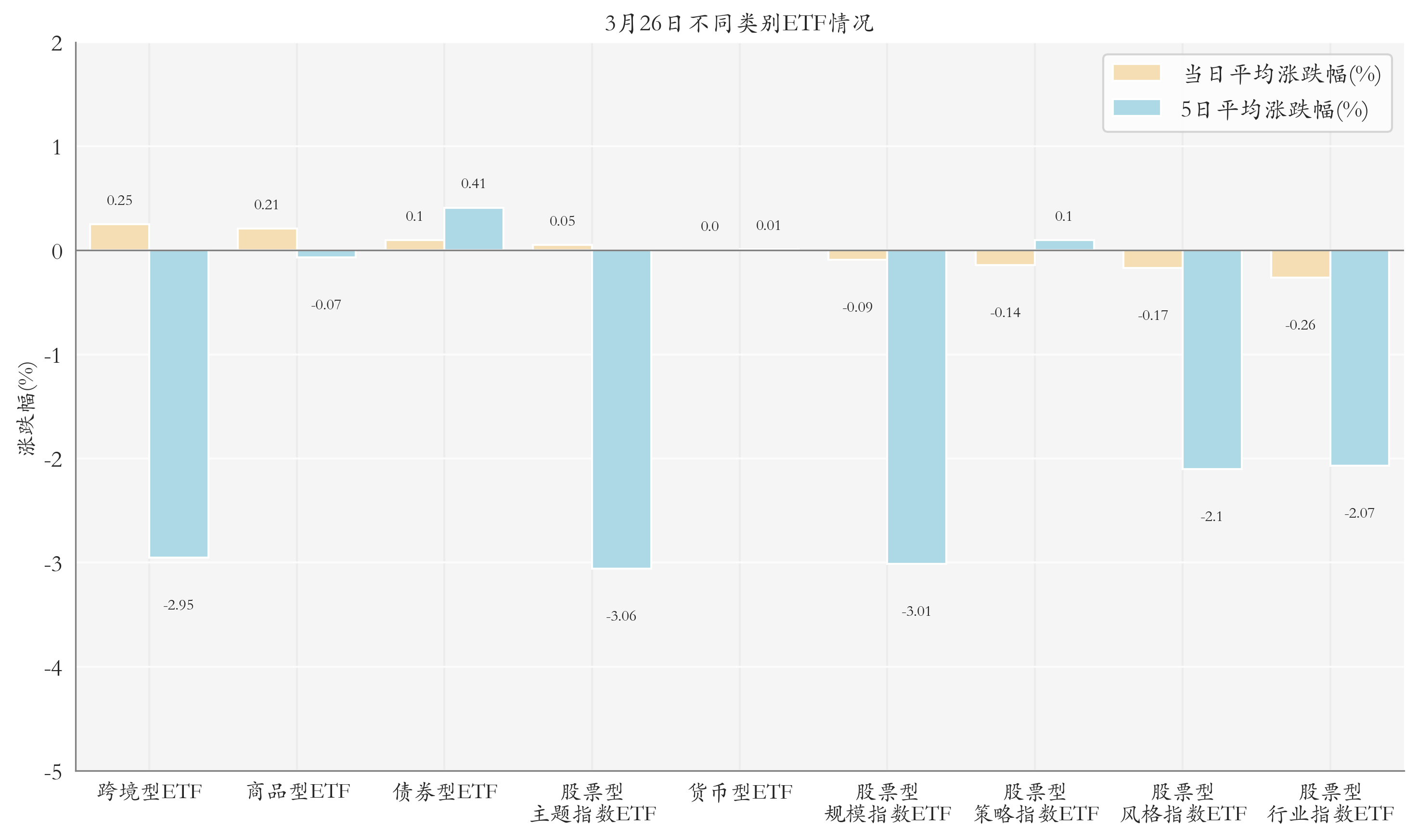 根据ETF基金的投资范围,将ETF基金划分为股票型规模指数ETF、股票型行业指数ETF、股票型策略指数ETF、股票型风格指数ETF、股票型主题指数ETF、债券型ETF、商品型ETF、货币型ETF、跨境ETF,今日跨境型ETF表现最优,该类ETF的平均涨跌幅为0.25%;股票型行业指数ETF的表现最差,该类ETF的平均涨跌幅为-0.26%。