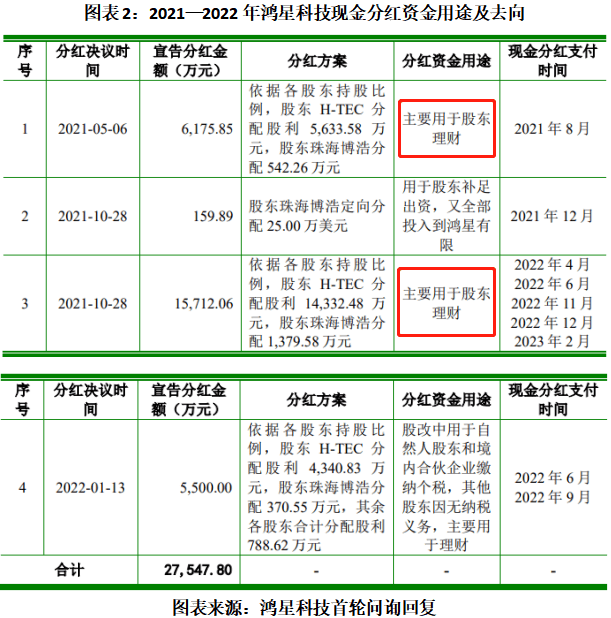 不过,根据鸿星科技2024年6月29日披露的《关于鸿星科技(集团)股份有限公司首次公开发行股票并在沪市主板上市申请文件的审核问询函之回复》(下称“首轮问询回复”)显示,2021—2022年该公司分配的2.76亿元现金分红中,有0.57亿元用于解决出资瑕疵及股改缴税等事项;而2021年5月、10月,鸿星科技单纯因回报股东而实施分红金额(含税)为2.19亿元,主要用于股东理财。