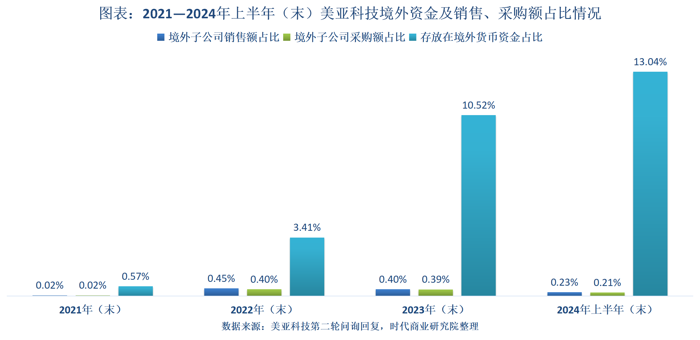 招股书及美亚科技2月5日披露的《关于广东美亚旅游科技集团股份有限公司公开发行股票并在北交所上市申请文件的第二轮审核问询函的回复》(下称“第二轮问询回复”)显示,2021—2024年上半年各期末,美亚科技存放在境外的货币资金分别为136.15万元、1147.77万元、2859.02万元、3791.67万元,占同期末货币资金总额的比例分别为0.57%、3.41%、10.52%、13.04%,无论是金额还是占比均呈持续大幅增长趋势。
