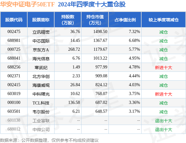 华安中证电子50ETF为指数型-股票基金,根据最新一期基金季报显示,该基金资产配置:股票占净值比98.95%,无债券类资产,现金占净值比1.21%。基金十大重仓股如下: