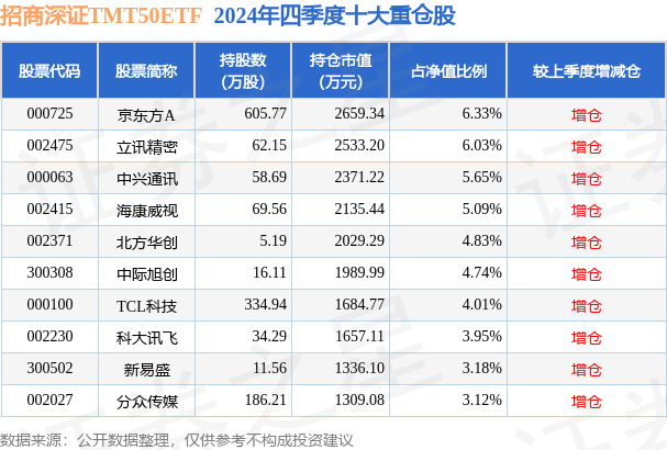 招商深证TMT50ETF为指数型-股票基金,根据最新一期基金季报显示,该基金资产配置:股票占净值比99.47%,无债券类资产,现金占净值比0.62%。基金十大重仓股如下: