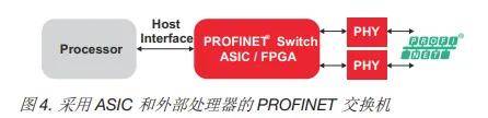 许多 PROFINET 设备都是使用分离式架构,在 FPGA 或 ASIC 上实现了一个 PROFINET 交换机,且添加了一个外部处理器(通常配备片上闪存),从而提升进行应用级处理所需的处理能力。传感器应用就是这种节点的典型示例。处理器操作传感器、实现设备驱动程序并运行 PROFINET 协议栈。这种架构允许设计人员选择适合自己需求和成本目标的处理器,但采用这种架构的 PROFINET 设备更昂贵,因为它需要两个独立芯片,并且主机处理器和 ASIC 之间的接口会成为性能瓶颈。