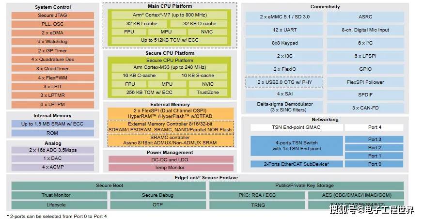 据恩智浦2023年表示, i.MX RT1180 跨界 MCU是业界首款集成千兆位时间敏感网络 (TSN) 交换机的跨界 MCU,可同时支持时间敏感通信和工业实时通信,并支持多种通信协议,从而弥合现有工业系统与工业 4.0 系统之间的差距。它也是首款集成 EdgeLock 安全区域的跨界 MCU ,这是一个预配置、自管理且自主的片上安全子系统,可降低为工业物联网应用实施强大的全系统安全智能的复杂性。