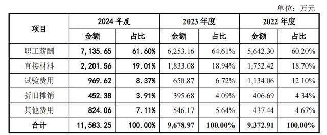 瑞立科密技术成果的取得归功于不断加码的研发投入。2022年-2024年,公司研发投入逐年增长,分别为9372.9万元、9678.97万元和1.16亿元,占营收的比例保持在5.50%-7.07%,三年研发投入复合增长率为11.17%。