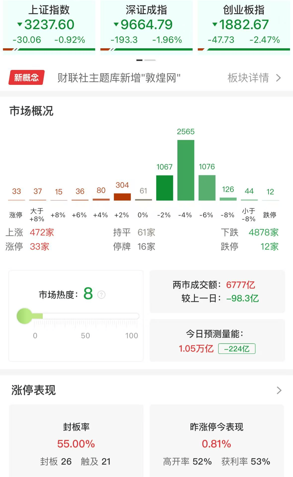 格隆汇4月16日|A股三大指数今日集体调整,截至午盘,沪指跌0.92%,深成指跌1.96%,创业板指跌2.47%,北证50指数跌2.69%。全市场半日成交额6955亿元,较上日缩量130亿元。全市场超4800只个股飘绿。板块题材上,贵金属、旅游及酒店、港口航运、物流、银行板块涨幅居前;农业、数据中心、养殖业板块跌幅居前。