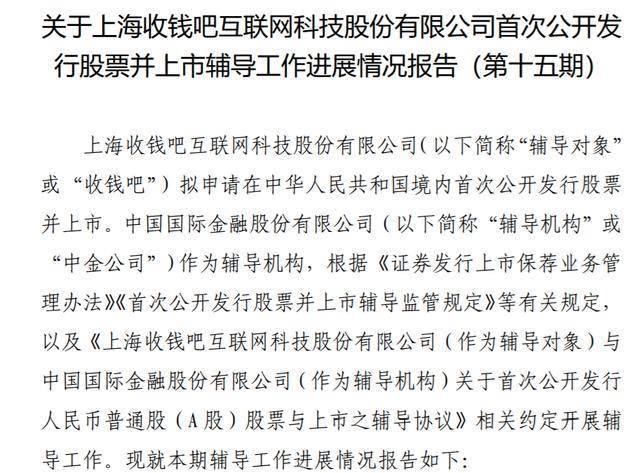 瑞财经 王敏 4月16日,中金公司发布关于上海收钱吧互联网科技股份有限公司(以下简称“收钱吧”)首次公开发行股票并上市辅导工作进展报告(第十五期)。