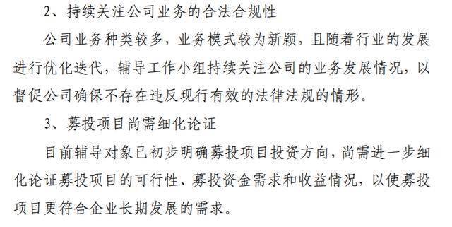 据中金公司报告,公司业务种类较多,业务模式较为新颖,且随着行业的发展进行优化迭代,辅导工作小组持续关注公司的业务发展情况,以督促公司确保不存在违反现行有效的法律法规的情形。