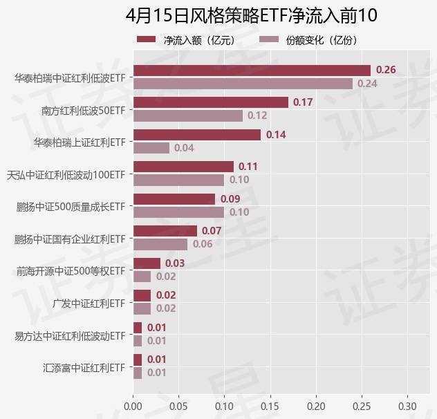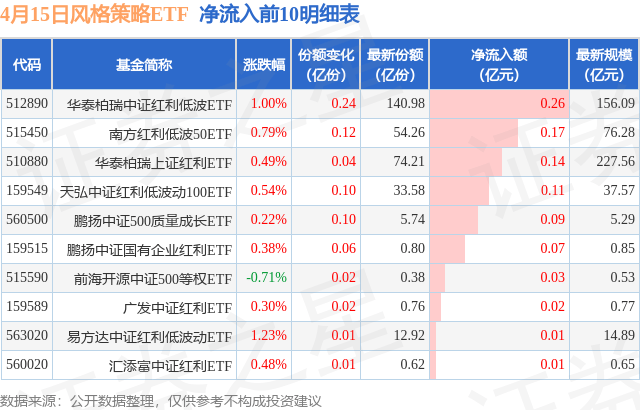 当日有11只风格策略ETF基金出现资金净流入,其中净流入排首位的是华泰柏瑞中证红利低波ETF(512890),份额增加了2400.0万份,净流入额为2642.94万元。