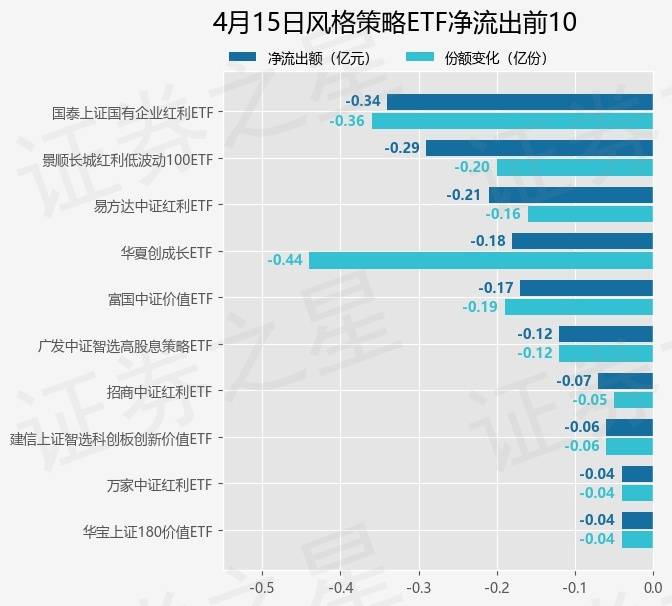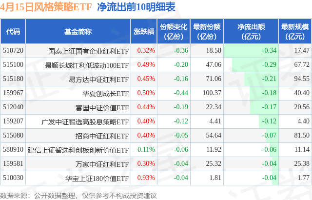 当日有20只风格策略ETF基金出现资金净流出,其中净流出排首位的是国泰上证国有企业红利ETF(510720),份额减少了3600.0万份,净流出额为3372.05万元。