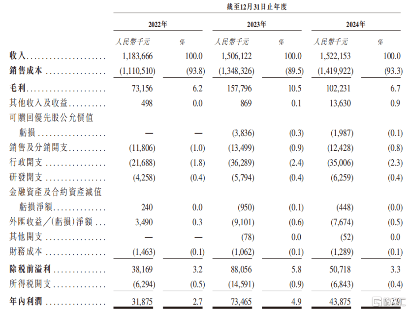 值得注意的是,顺友物流2024年的经营活动所得现金流量为负,为约-2726.3万元;这主要是由于2024年贸易应付款项有所减少,而同时一名主要客户的交易金额相对较高,贸易应收款项有所增加。而2022年及2023年,公司经营活动所得正现金流量分别约为59.4万元及1.59亿元。
