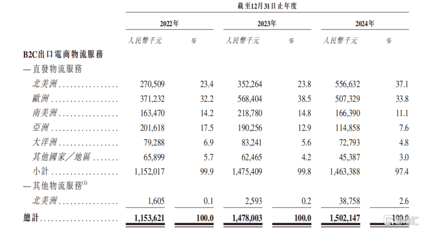 按包裹目的地划分的B2C出口电商物流服务收入明细,来源:招股书